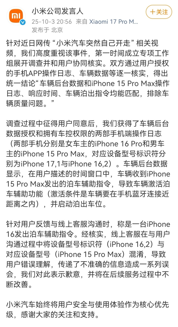 看回复,小米后面成立了专门的工作组处理这件事情,对后台的数据进行了查看。最终的结果,就是消费者自己误碰了手机,给手机发出了指令,然后小米汽车就自己开走了。